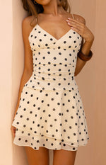 Exude timeless romance in our Hadleigh Cream Polka Dot Mini Dress, the ultimate choice for your next garden party or afternoon tea. Crafted from light chiffon, this piece features a drop waist detail and a V wrap bust panel for a soft, feminine silhouette. Style with neutral mules and gold hoops for a polished, sun-ready finish.