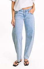 Elevate your denim collection with our Jannina Light Wash Jeans, the on-trend staple for effortlessly cool everyday style! Featuring a relaxed barrel leg and a raw hem, these low-rise jeans are finished with edgy stud detailing around the front and back pockets. Style them with a baby tee and sneakers for a perfect model-off-duty look.