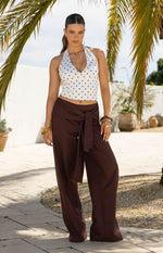 Embrace resort-style elegance with our Kady Brown Linen Tie Pants. Crafted from a lightweight cotton blend, these pants feature a relaxed wide leg and a functional tie panel at the waist for a custom fit. Pair them with a crop top and sandals for a chic, European summer aesthetic.