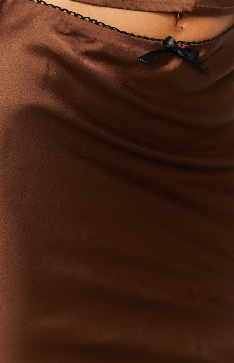 This sleek brown satin material gives this skirt a classic and elegant look and its minimal black lace and bow detailing is throwing us back to 2000's fashion. Pair with low brown or black heels and a matching bag.