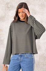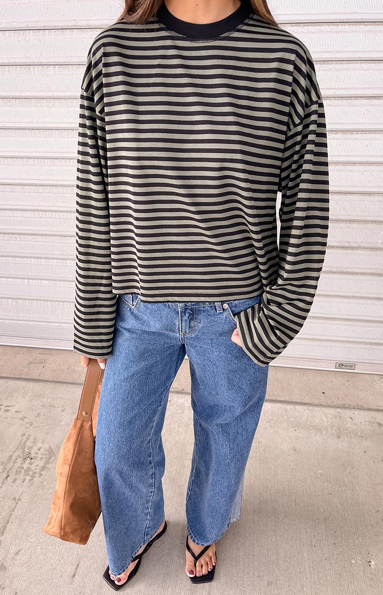 Channel cool-girl energy in The Bloom Forest Stripe Long Sleeve Top by Lioness, an everyday staple with an edge! This essential top features a deep green and black stripe design, a classic crew neck, and an intentionally oversized, boxy fit for that perfect slouchy look. Pair it with relaxed-fit pants or your favourite jeans for an instantly cool look!