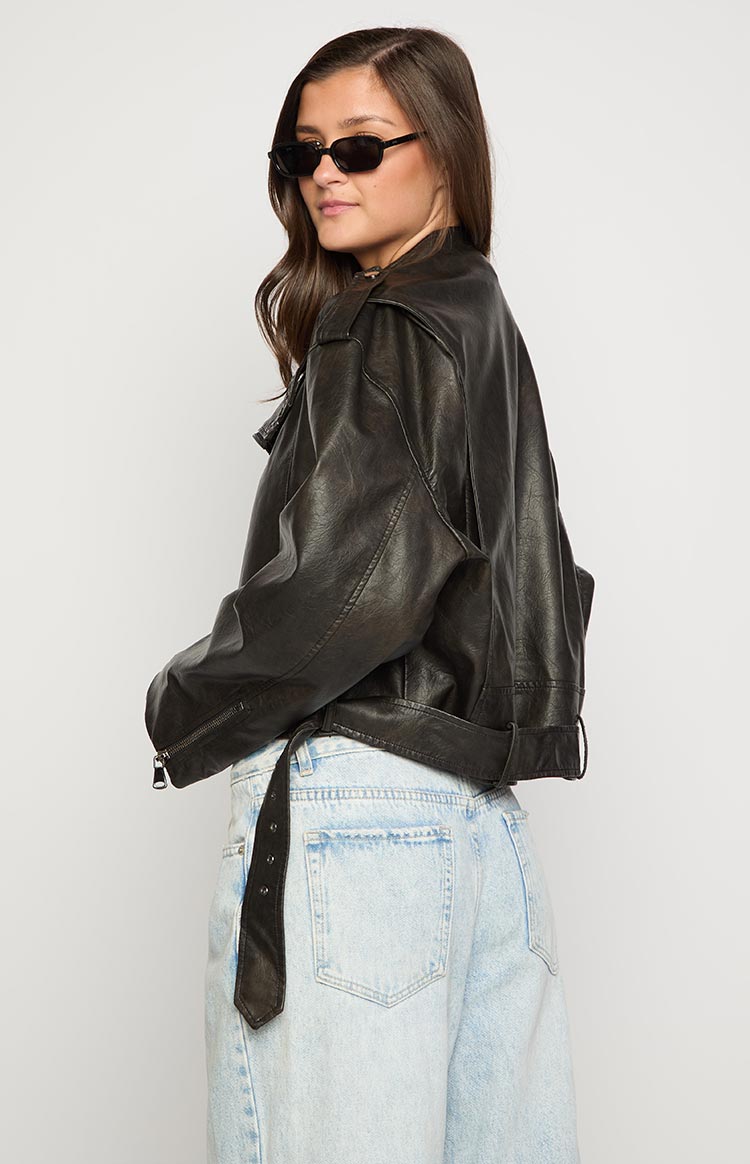 Embrace the oversized look with The Lioness Onyx Driftwood Bomber. This vegan leather jacket features a press stud collar, zip detailing, and a removable belt for a cinched silhouette. This item runs oversized, so layer it over your favourite mini or crop for an effortlessly bold statement.