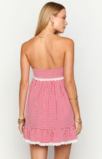 Red Gingham Strapless Mini Dress with Broderie Trim