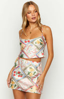 The ultimate two piece set! Add some colour to your wardrobe this summer and feel good in this Italian floral print crop. Mix and match with the matching skirt, or change things up with a pair of jeans and brown mini shoulder bag.