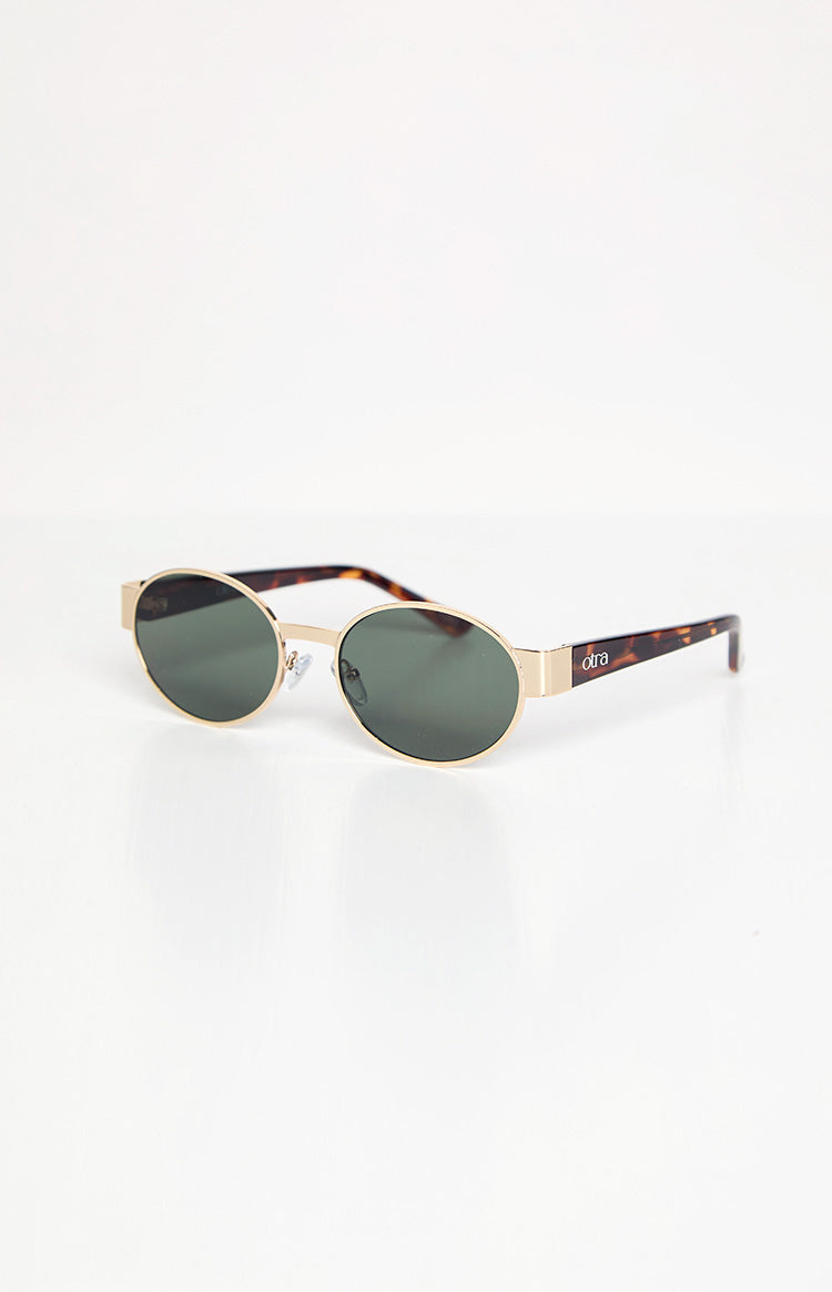 The Echo Gold Tortoiseshell Round Sunglasses by Otra exude luxe elegance! The round metal frame with a shiny gold finish and tortoiseshell temples creates a sophisticated, timeless look, while the green lenses add a unique touch. Perfect for summer days, pair this stunning accessory with gold jewellery for a luxe, complementary look!