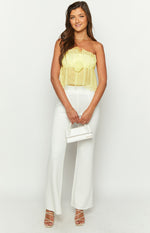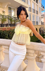 - The perfect top for bottomless brunch or afternoon drinks! Pair this lemon coloured crop top with your favourite white pants or maxi skirt. Add some gold jewellery to finish the look!