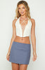 - Join in on the steel blue trend with this cute mini skirt! The most complimentary colour ever, we love to style this skirt with white pieces to really make it pop. Pair it with a white short sleeve and jewellery for a put together look.